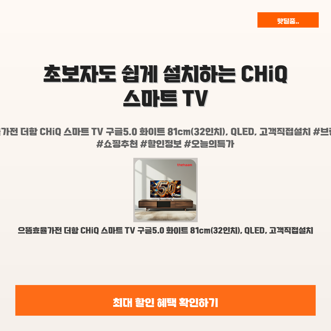 🛍️ 이 포스팅은 네이버 쇼핑 커넥트 활동의 일환으로,판매 발생 시 수수료를 제공받습니다.오늘 소개할 제품은 단언컨데,,그야말로 완벽한, 갓벽한, 감동적인 제품이라구요요즘 집에서 영화나 게임을 즐기는 분들 많으시죠? 완전 필수 아이템인 CHiQ 스마트 TV를 소개할게요!"으뜸효율가전 더함 CHiQ 스마트 TV 구글5.0 화이트 81cm(32인치), QLED, 고객직접설치" 이거 정말 대박이에요!집에서 간편하게 고화질 영화를 감상하고 싶었던 저의 고민... 이 제품으로 한 방에 해결됐어요!설치도 초간단하니까 초보자도 문제없이 집에서 직접 설치할 수 있어요.가격도 합리적이에요! 46% 할인된 199,000원에 이 규격 최고의 품질을 가질 수 있다니, 믿기지가 않네요주변 친구들에게도 추천하고 싶은 제품이에요..